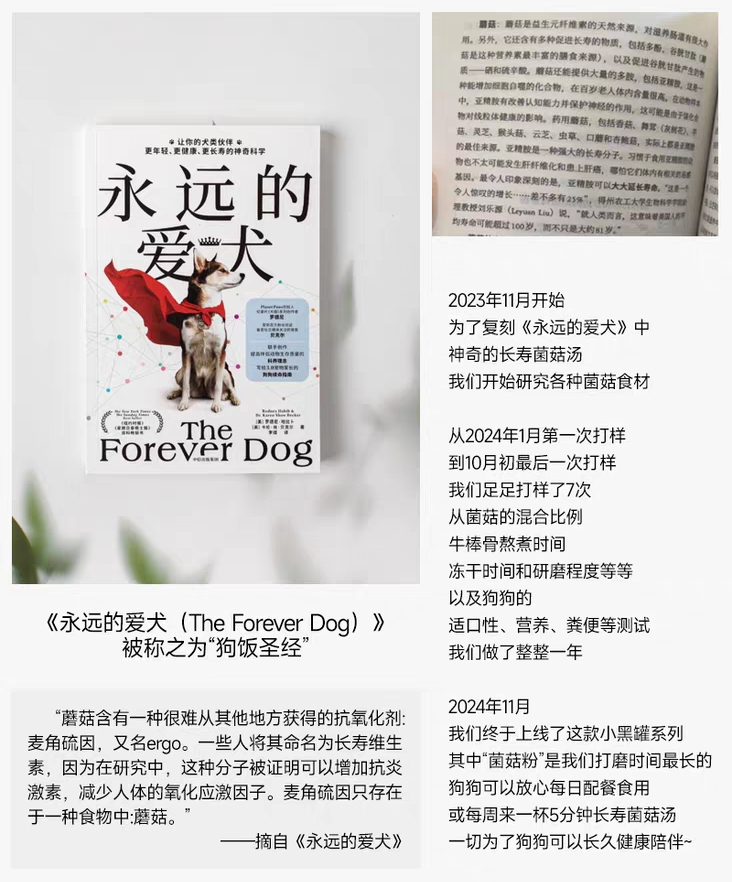 还有一些品牌正倡导“宠物食养”理念,主张将传统中草药成分融入宠物的日常保健。例如,受到《永远的爱犬》一书中“长寿菌菇汤”配方的启发,有品牌通过研究多种菌菇的科学配比和精细研磨工艺,推出了更方便配餐食用的菌菇粉。