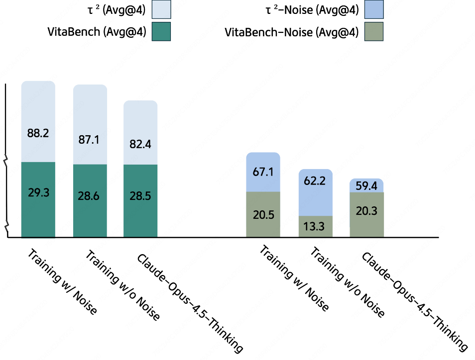 经过系统化的抗干扰训练,LongCat-Flash-Thinking-2601(Training w/Noise组)拥有了极强的环境适应能力,在复杂场景中,也能稳定发挥、高效完成任务。