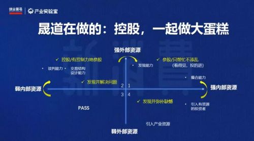 如何发现需求,晟道投资做控股交易有一个思路,这张图纵轴表示的是外部资源,横轴是内部资源,内部资源是你里面的人,以人、技术、技术等等为主。外部讲的首先是资本,第二就是一些可以给你赋能的合作伙伴,取决于他们跟你的合作方法,我们在做投资企业,我们不管是入股还是参股,可以看到第三个上线就是PASS不要去考虑,第一象限里的企业属于外部跟内部都很强,投资这样的企业也是参股交易的逻辑。