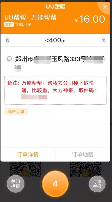 记者还了解到,使用UU跑腿取快递的情况还有很多。用户王先生因“剁手”太快留错地址,只好让跑腿小哥哥帮忙取送。还有因为买的商品是送给朋友的礼物,也用UU跑腿帮忙。