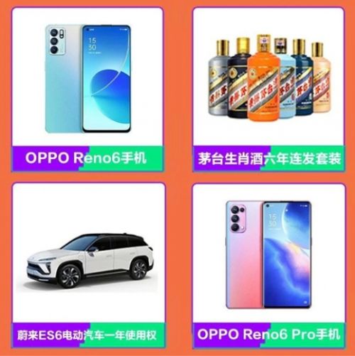 还有一个活动不花钱你也可以参与哦——在今晚苏宁易购不同主题的直播间中,5月31日23:40、6月1日0点、6月1日0:30、6月1日01:00这四个时间点,将会有0元抽奖活动。每个时间点推出一款爆款,分别是OPPO Reno6手机、茅台生肖酒6年联发套装、蔚来ES6电动汽车一年使用权、OPPO Reno6 Pro手机。无需花钱,纯拼手速,抽到就是你的!