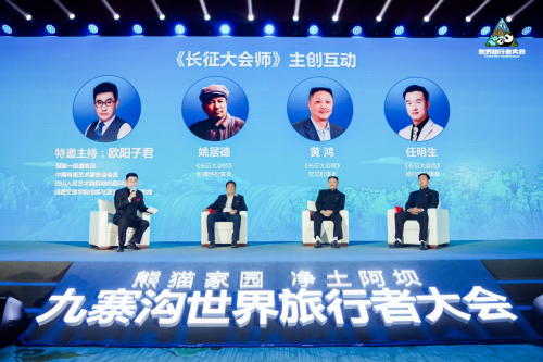 在以九寨沟特有的自然景观为优势的基础上,世界旅行者大会深度挖掘阿坝州境内多处革命据点。在特邀主持人欧阳子君教授风趣幽默的串联下,《长征大会师》主创演员姚居德、黄鸿、任明生的深度联动,还原革命故事、缅怀革命先辈、讴歌革命精神。三位主创演员联合呈现了题为《红色阿坝的前世今生》的诗歌朗诵。声情并茂地为大众展现了那个慷慨激昂的革命岁月,在拓展红色旅游的同时,也激发广大人民群众的爱国热情。