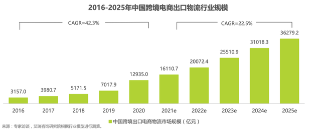 根据艾瑞资讯发布关于「 2016—2025年中国跨境电商出口物流行业规模」报告中显示,中国跨境出口电商物流行业规模近 10 年来也增长 10 倍以上。