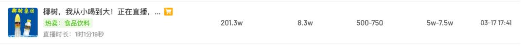 然而,数千万人流在推高直播间热度的同时,却并未带来产品的热销。数据显示,椰树集团海南椰汁饮料有限公司近三个月的销售额在75万元-100万元,直播间销量在1万-2.5万。以3月17日的一场直播为例,1个小时的直播就有200万人次冲进直播间,但是销售额却只有5万元-7.5万元,平均每人仅消费0.03元。