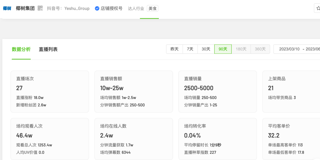 另一个官方抖音号“椰树集团”,直播数据更加惨淡。近三个月数据显示,椰树集团账号直播27场次,累计1253万人次涌进直播间,直播间销售额累计10万元-25万元。以6月1日的一场直播来看,1小时的直播有165万人次观看,最高在线人数达到了9万,但是销售额只有2.5万元-5万元。