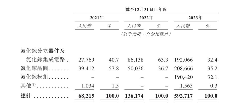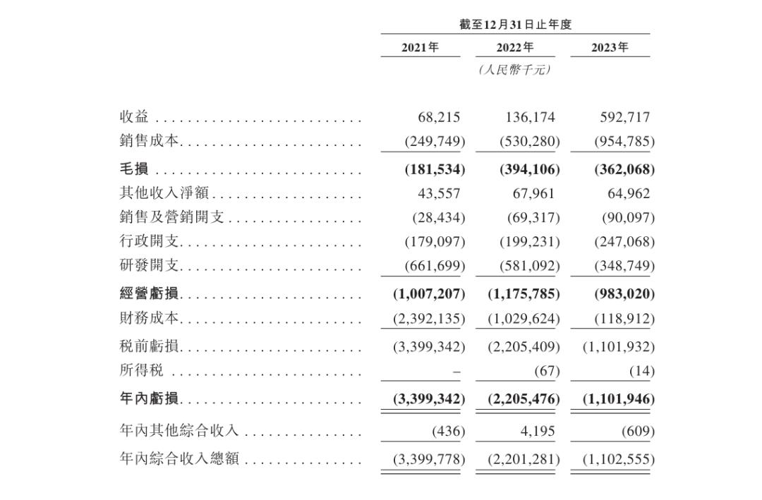 2021年、2022年及2023年,英诺赛科营收分别为6821.5万元、1.36亿元及5.93亿元,复合年增长率为194.8%;毛利亏损分别为1.82亿元、3.94亿元及3.62亿元;同期,英诺赛科净亏损分别为33.99亿元、22.06亿元及11.02亿元;经调净亏损分别为10.81亿元、12.77亿元及10.16亿元。