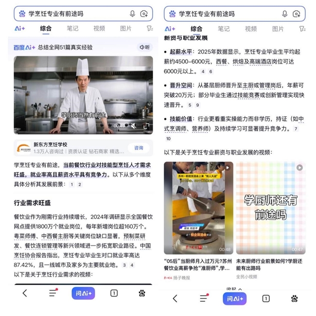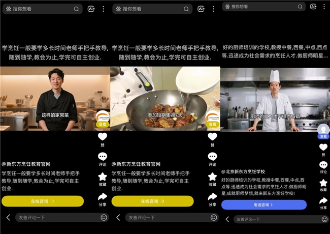 当潜在用户搜索相关关键词时,结果页顶部不再只是文字链接,而是基于大模型精准理解需求、给出答案。可能是厨师学员在明亮灶台前的实操视频画面,也可能是汽修讲师拆解发动机的讲解片段,大幅降低了用户二次筛选信息的成本。视频下方,咨询入口或智能对话按钮直接嵌入,形成“即看即问”的极短路径。
