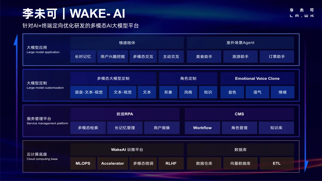 实现这一切的背后,是李未可全面升级的 “超能李未可”系统。基于自研WAKE-AI 大模型基础,采用多智能体协同的“群体智能”模式,协同20+主流大模型与70+智能体,根据任务的复杂程度实现动态调度与决策,完成从“即时应答”到“深度协同”的无缝衔接。通过端到端的任务理解与执行闭环,使系统能够自主完成从指令解析、规划拆解到结果交付的全过程。